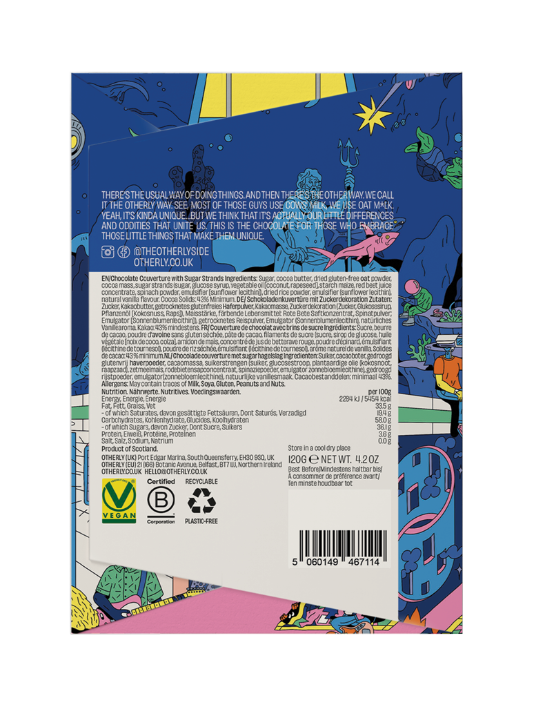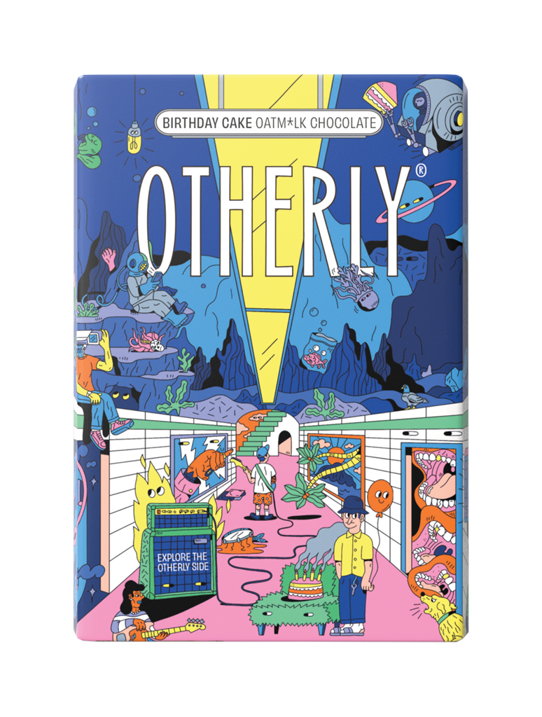 OTHERLY Birthday Cake Oatm*lk is a plant-based chocolate 43% cacao content made with fine flavour cocoa beans from Colombia and oat powder; Taking a bite, the chocolate yields with a satisfying snap, releasing a burst of flavors on your palate. The creamy, velvety texture of the oatm*lk chocolate envelops your taste buds, providing a luxurious mouthfeel that complements the sweetness perfectly. Within this harmonious blend, you encounter crunchy bits that add a delightful contrast to the smoothness. These are the cake-like components, woven into the chocolate, imitating the tender crumb of a birthday cake. Each nibble brings forth playful sensations, as a sensory celebration, delighting both the taste buds and the heart.