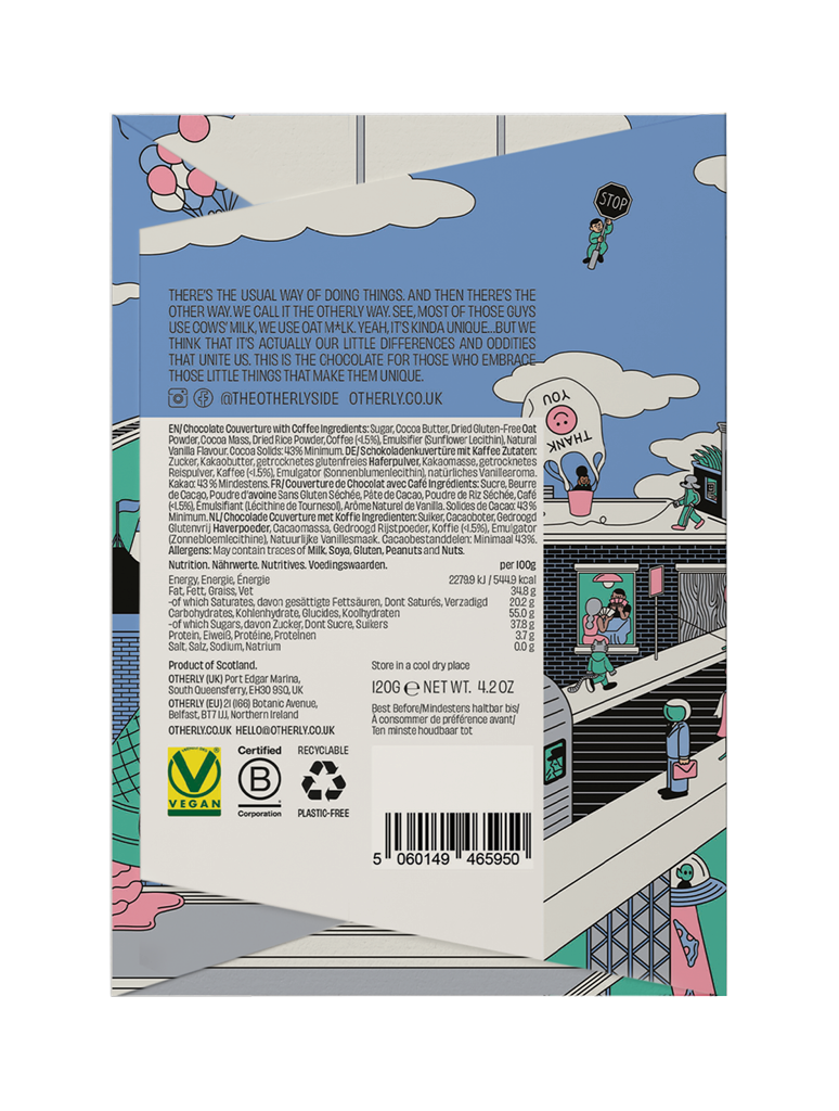 For the coffee and plant-based chocolate lovers, OTHERLY Cold brew Coffee Oatm*lk 43% cacao content is the ideal option to savour the rounded full-bodied tones of our selected blend of roasted coffee, matching the chocolate-like tones and cereal notes delivered by the creamy-melting rate of this exclusive bar made with fine flavour cocoa beans from Colombia.