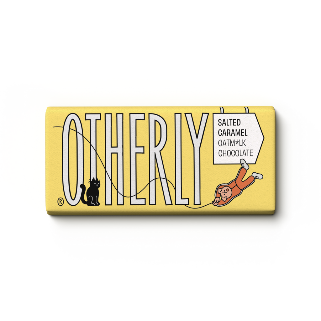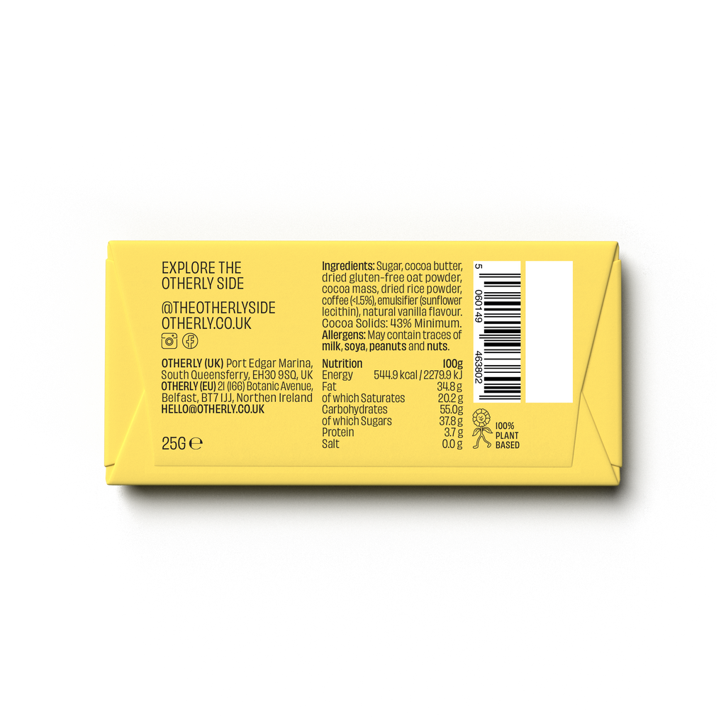 Sugar, cocoa butter, dried gluten-free oat powder, cocoa mass, dried rice powder, sea salt (<1%), emulsifier (sunflower lecithin), natural flavours (caramel, vanilla). Cocoa Solids: 43% Minimum. May contain traces of milk, soya, gluten, peanuts and nuts. Suitable for vegans and vegetarians.
