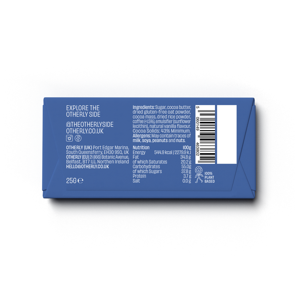 Sugar, cocoa butter, dried gluten-free oat powder, cocoa mass, dried rice powder, sea salt (<1%), emulsifier (sunflower lecithin), natural vanilla flavour. Cocoa Solids: 43% Minimum. May contain traces of milk, soya, gluten, peanuts and nuts. Suitable for vegetarians and vegans.